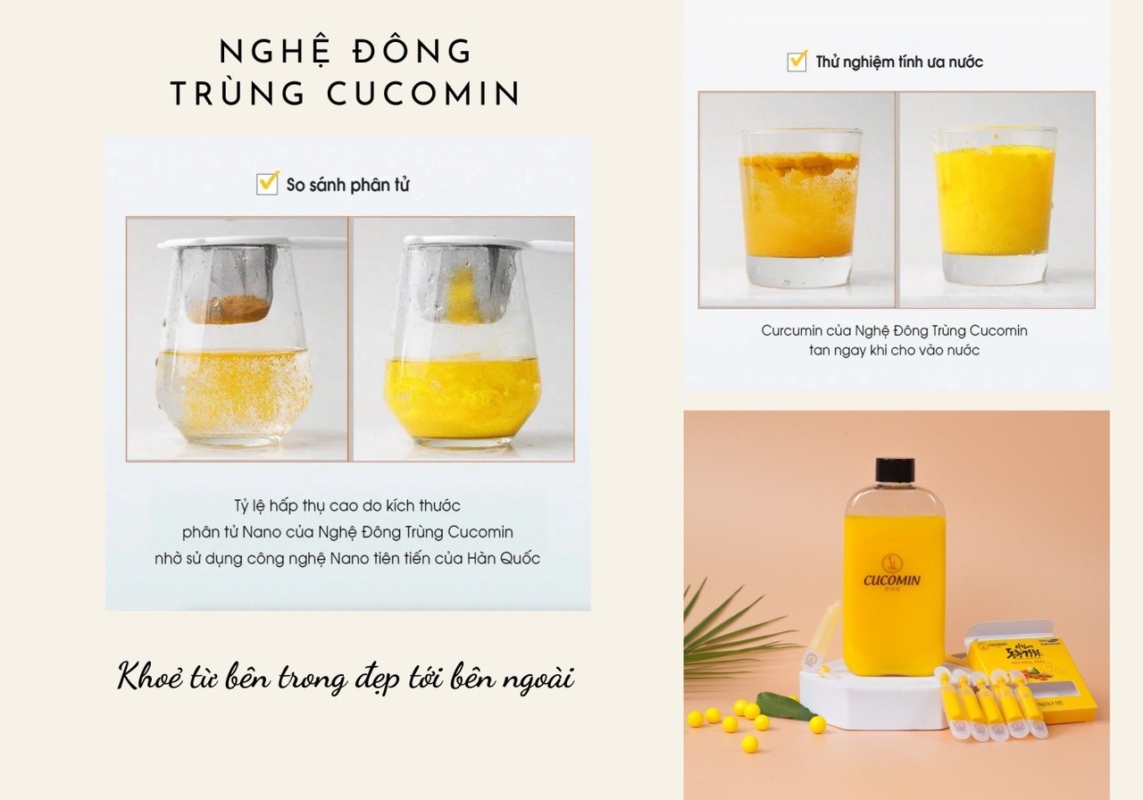 Chia sẻ về sự khác biệt so với các sản phẩm thông thường khác trên thị trường, đại diện nhà phân phối tại Việt Nam cho biết, Nghệ là một thành phần hòa tan trong chất béo và tỉ lệ hấp thụ rất thấp, khó hoà tan trong nước (dưới 1%). Và để khắc phục những nhược điểm này, Nghệ đông trùng Cucomin, đã được sản xuất theo công nghệ Nano tiên tiến của Hàn Quốc, hoà tan trong nước, giúp nâng cao khả năng hấp thu lên hàng nghìn lần.